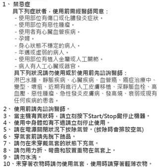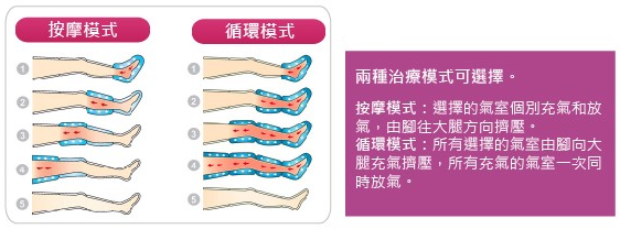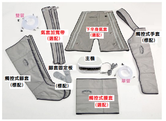 ● 原理(lǐ): 利用(yòng)氣套內氣體的加壓充氣,幫助促進血液循環,以達到按摩或減輕肌肉疼痛的作(zuò)用(yòng)。